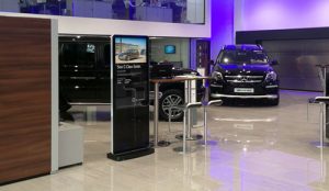 The display can be wall mounted as standard or mounted onto a stylish floor stand, for easy portability. The modern stand also features an illuminated blue LED strip.